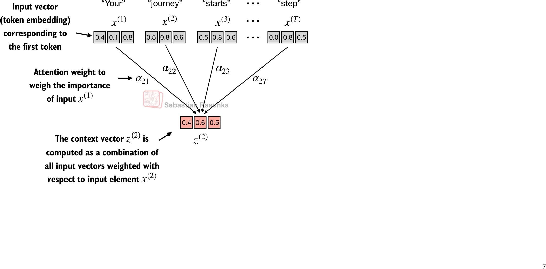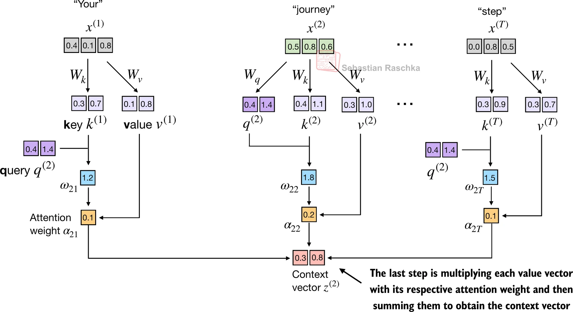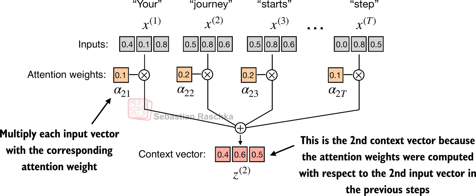 Step 3: Compute the context vector by multiplying the embedded input tokens, with the attention weights and sum the resulting vectors.