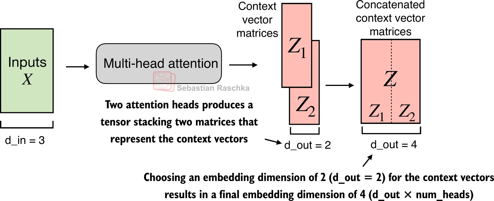 In the implementation above, the embedding dimension is 4, because we d_out=2 as the embedding dimension for the key, query, and value vectors as well as the context vector. And since we have 2 attention heads, we have the output embedding dimension 2*2=4.