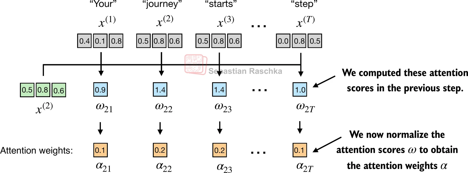 Step 2: Normalize the unnormalized attention scores (“omegas”, ) to get the attention weights ().