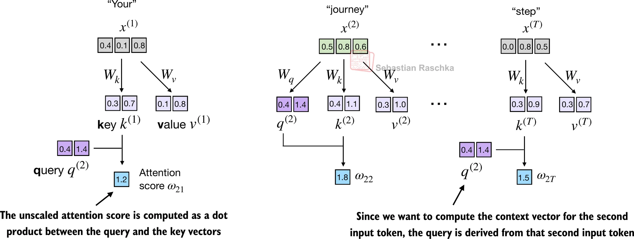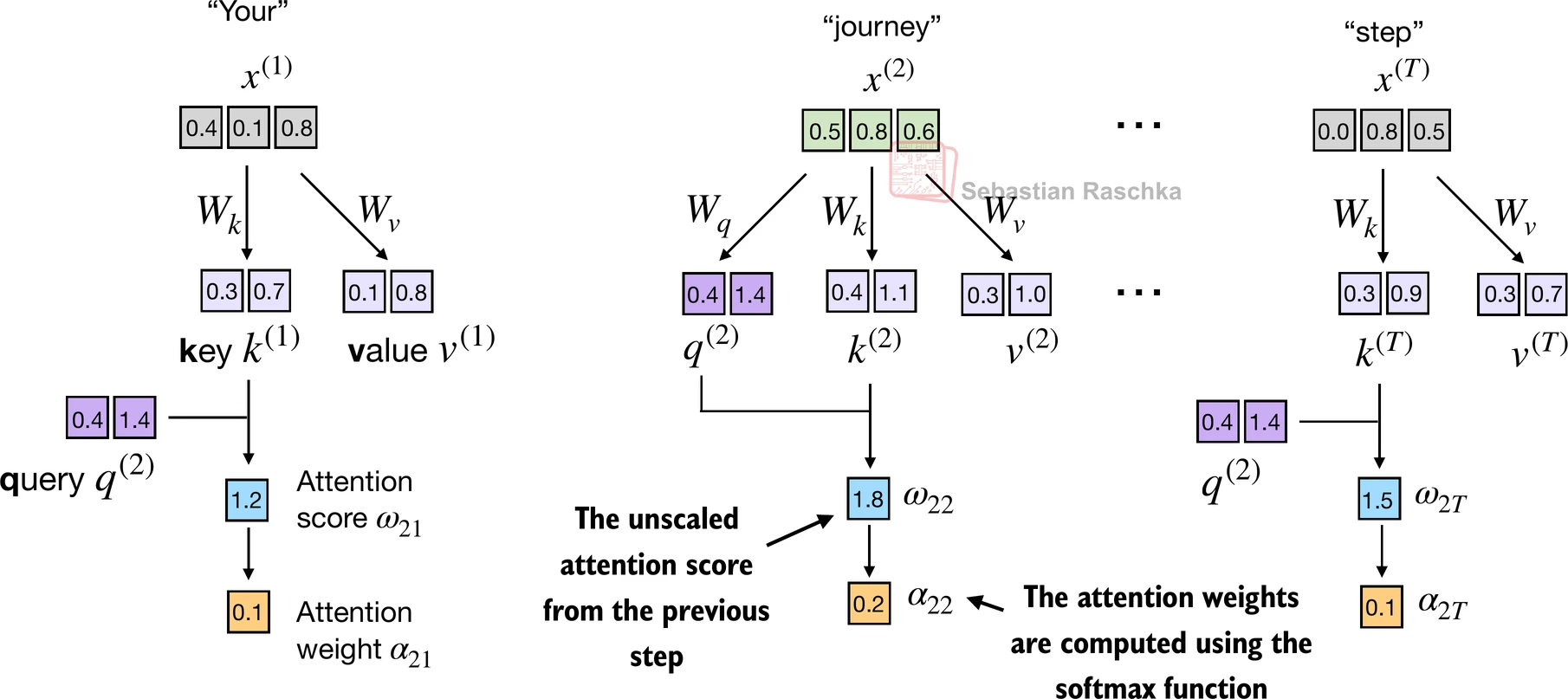 Suppose we use the second input token as the query, that is, , we compute the unnormalized attention scores via dot products: