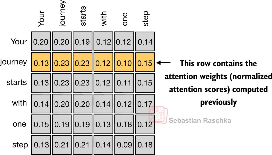 print(attn_weights)tensor([[0.2098, 0.2006, 0.1981, 0.1242, 0.1220, 0.1452],