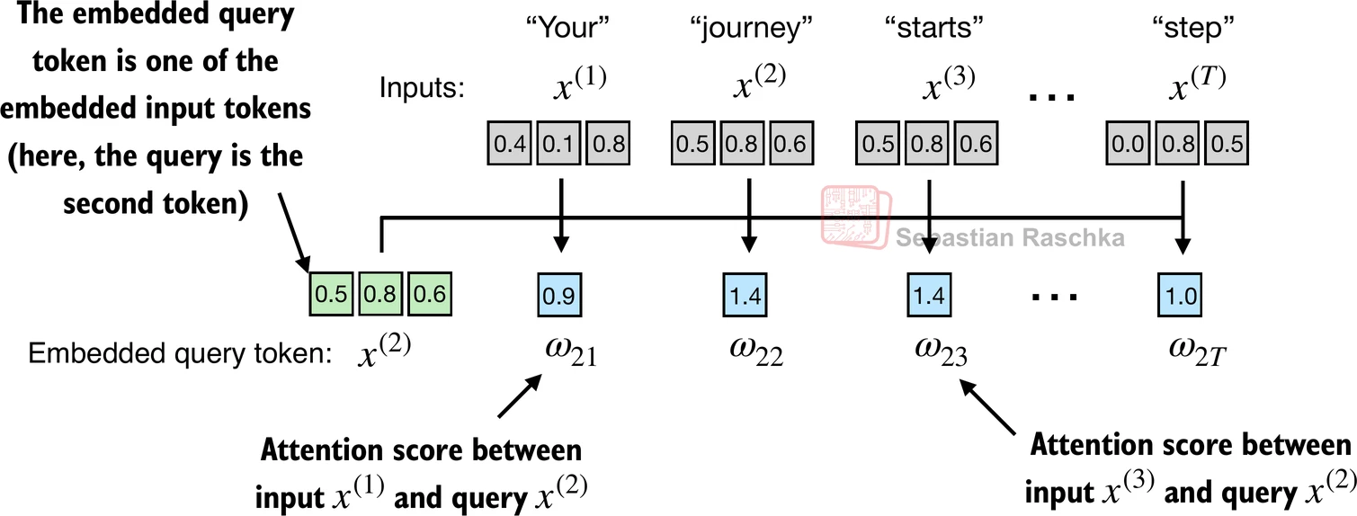 attn_scores_2[i] = torch.dot(x_i, query) # dot product (transpose not necessary here since they are 1-dim vectors)