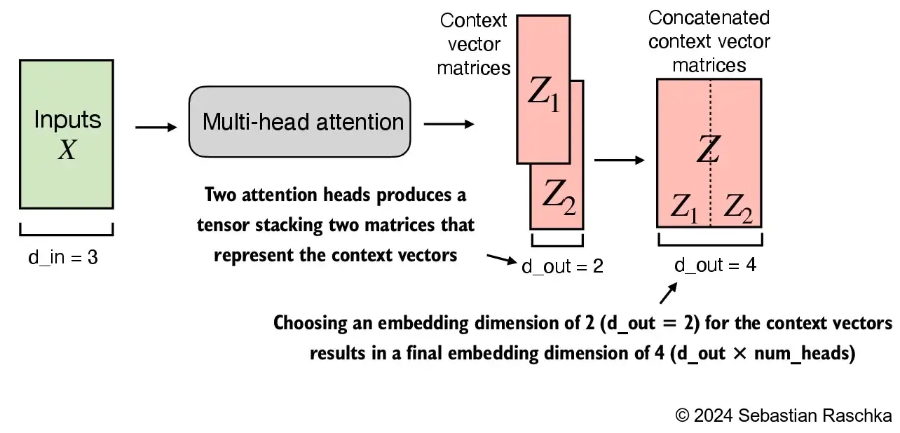 as the embedding dimension for the key, query, and value vectors as well as the context vector. And since we have 2 attention heads, we have the output embedding dimension 2*2=4