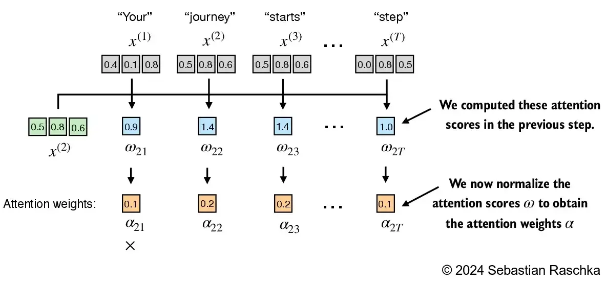 Step 2: Normalize the unnormalized attention scores (“omegas”, ) to get the attention weights ().