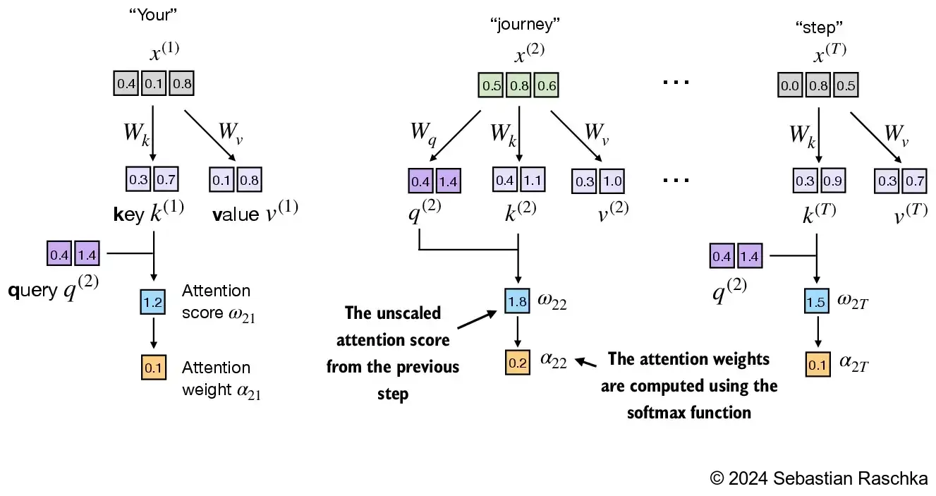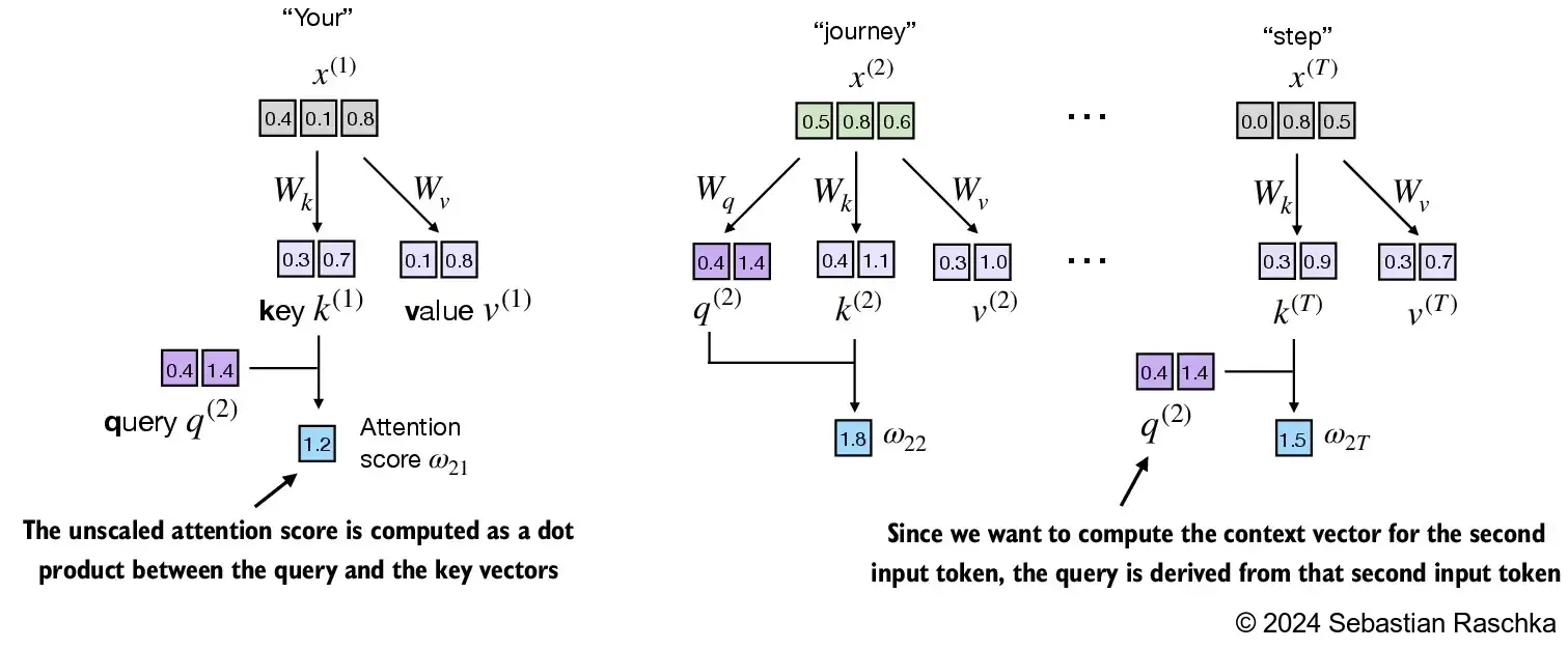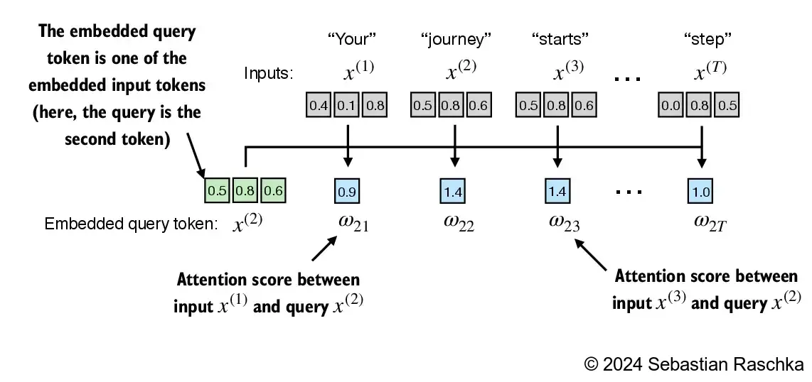 - Suppose we use the second input token as the query, that is, , we compute the unnormalized attention scores via dot products:
