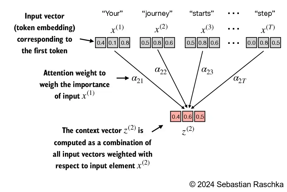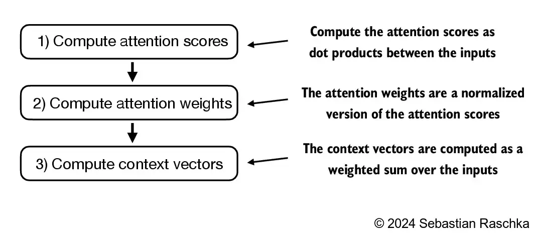 Step 3: Compute the context vector by multiplying the embedded input tokens, with the attention weights and sum the resulting vectors.