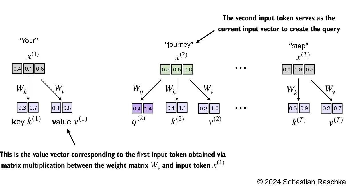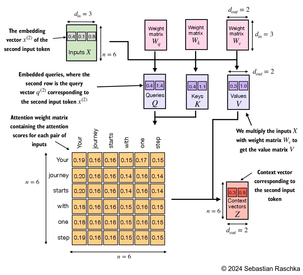 - The second context vector, , is a weighted sum over all inputs to weighted with respect to the second input element, .