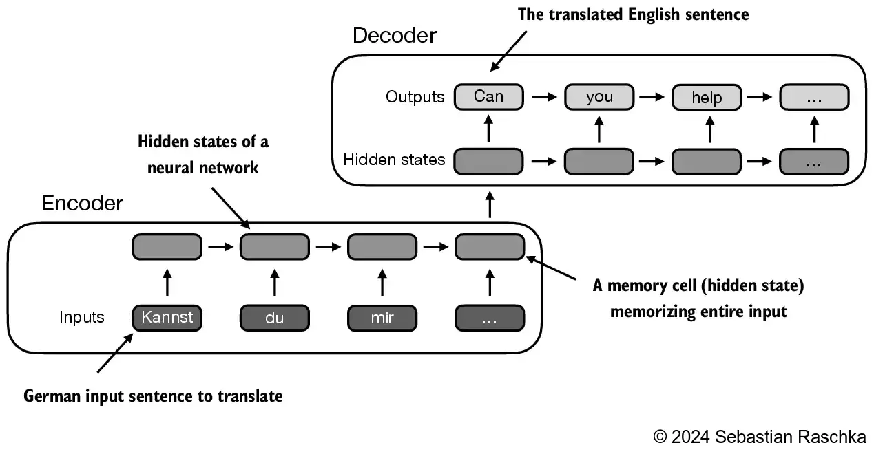 - In this setup, the encoder processes a sequence of tokens from the source language, using a hidden state—a kind of intermediate layer within the neural network—to generate a condensed representation of the entire input sequence.