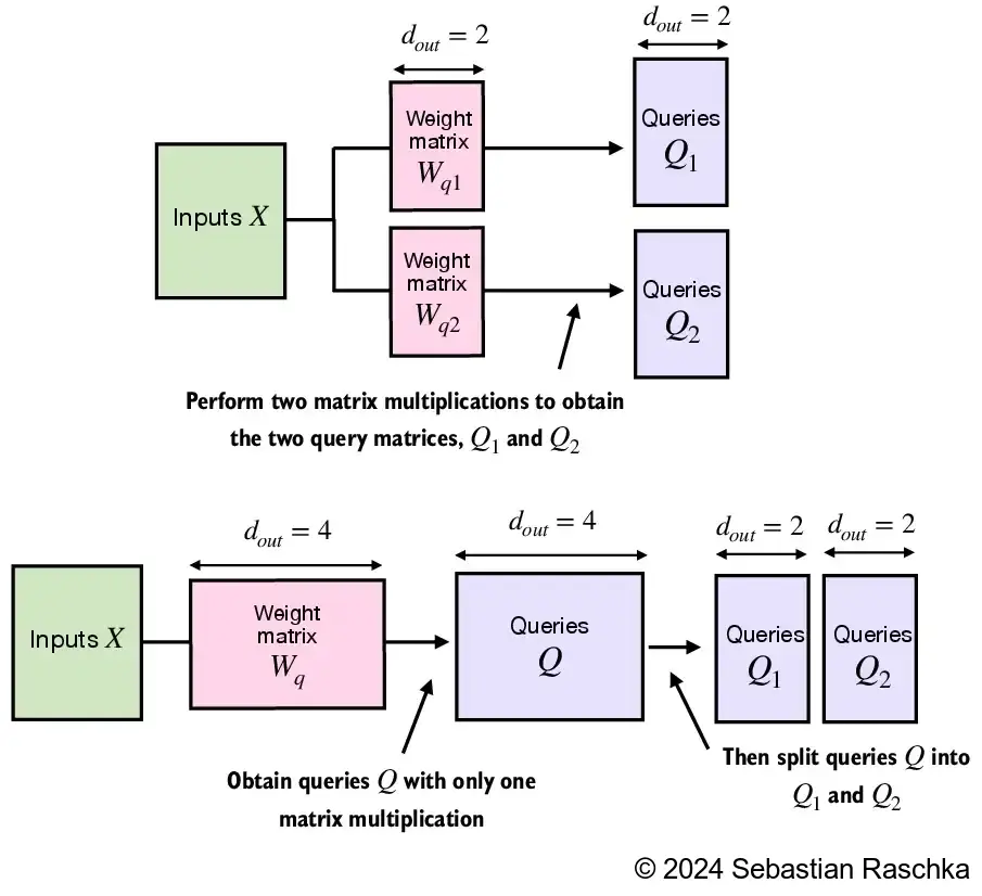 classInstead, we create single W_query, W_key, and W_value weight matrices and then split those into individual matrices for each attention head: